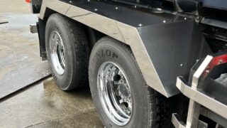 取付け写真 ダンプフェンダー取付け写真 轟パーツ(日本製)オリジナルフェンダー各写真 拡大できますステンレスリアフェンダー板厚1.5大型 ダンプ10t用一段曲げ 舟形タイプ 中型 ダンプ 4t用 二段曲げ 舟形タイプ 取付け写真